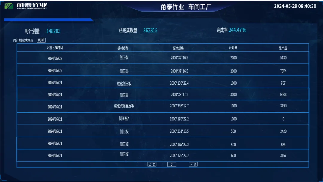 通過引入電子看板系統,甬泰竹業實現了生產管理的目視化。管理人員可以直觀地了解整個車間的生產情況,包括各個工序的進度、產品質量等。同時,員工也可以通過電子看板系統了解自己的工作進展和產線的整體情況,從而更加自覺地投入到工作中。